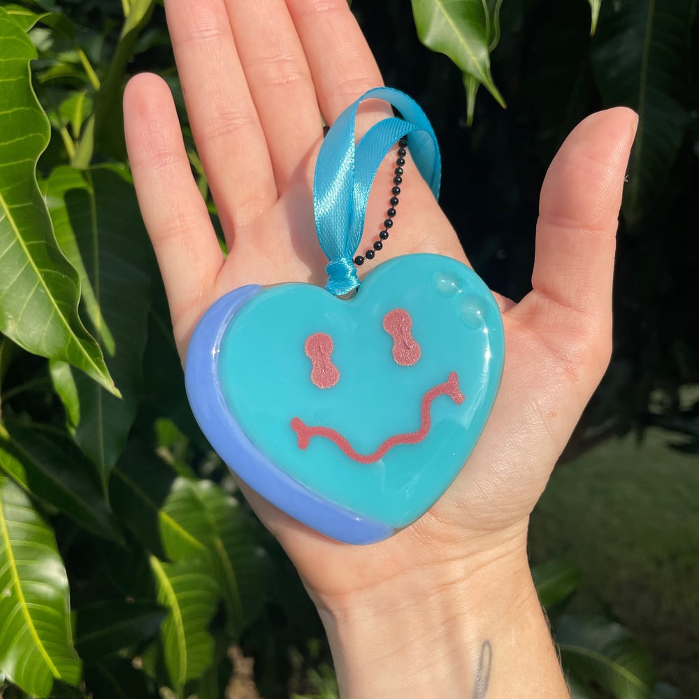 Each heart ornament comes with a removable ball chain and a matching ribbon.