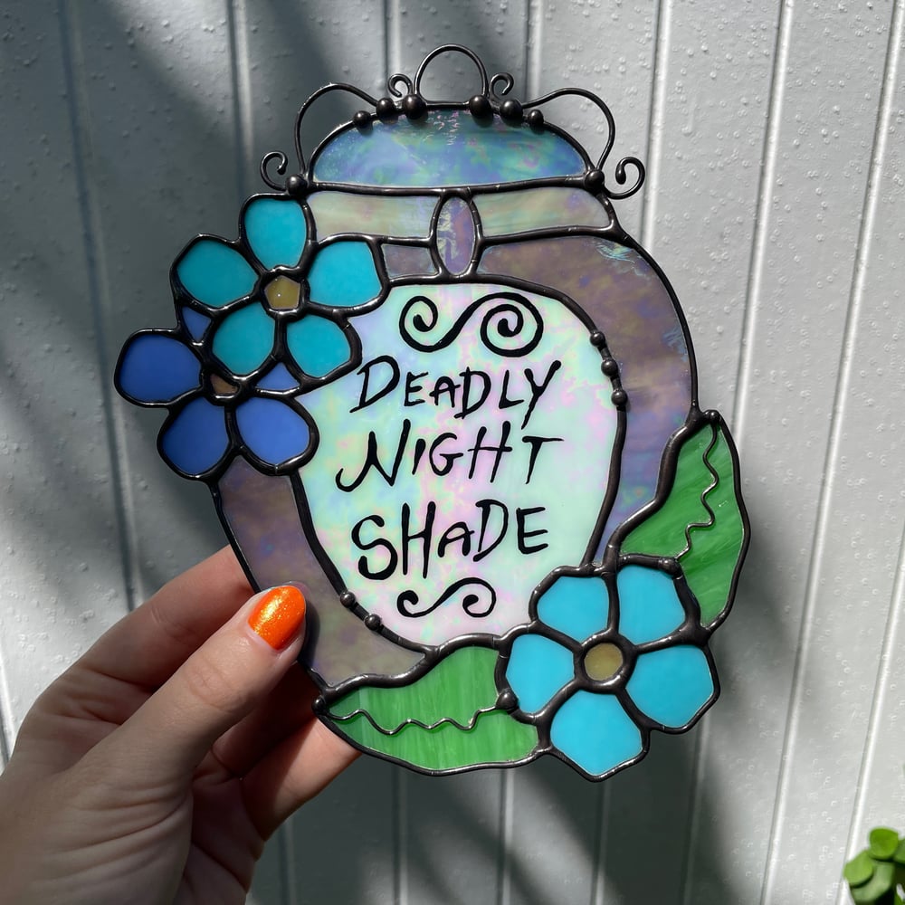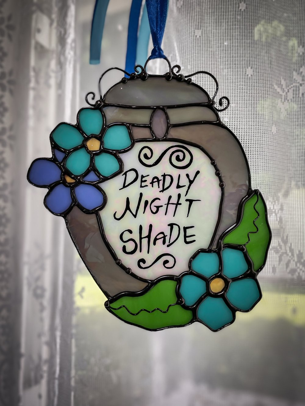 Stained glass deadly nightshade suncatcher/wall hanging with hand painted letters.